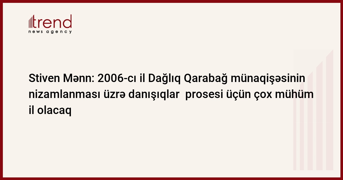 2006-cı il Dağlıq Qarabağ münaqişəsinin nizamlanması üzrə danışıqlar prosesi üçün çox mühüm il olacaq. Həm ATƏT, həm də bizim təmsil etdiyimiz ölkələr sülh razılaşmasının imzalanması üçün mümkün olan hər şeyi edəcəklər. Belə bir bəyanatla ATƏT-in Minsk Qrupunun amerikalı həmsədri Stiven Mənn Bakıya gələrkən çıxış edib.