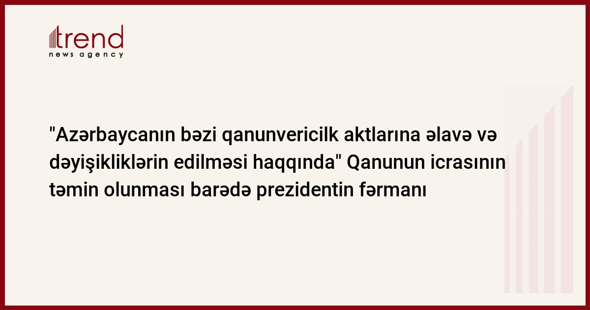 Trend in xəbər verdiyi kimi, Azərbaycan prezidenti İlham Əliyev "Azərbaycan Respublikasının bəzi qanunvericilik aktlarına əlavə və dəyişikliklərin edilməsi haqqında" 1 sentyabr 2005-ci il tarixli Azərbaycan Respublikası Qanununun icrasının təmin olunması barədə fərman imzalayıb.
