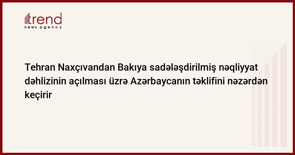Tehran Naxçıvandan Bakıya sadələşdirilmiş nəqliyyat dəhlizinin açılması üzrə Azərbaycanın təklifini nəzərdən keçirir. Trend in məlumatına görə,bu barədə dekabrın 22-də İranın Bakıdakı səfiri Əfşar Süleymani mətbuat konfransında bəyan edib.