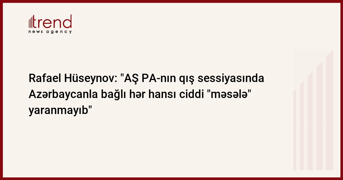 Avropa Şurası Parlament Assambleyasının qış sessiyasında Azərbaycanla bağlı hər hansı ciddi "məsələ" yaranmayıb". Azərbaycanın AŞ PA-dakı parlament nümayəndə heyətinin üzvü Rafael Hüseynov cümə günü başa çatan sessiyanın yekunlarını Trend ə belə şərh edib.