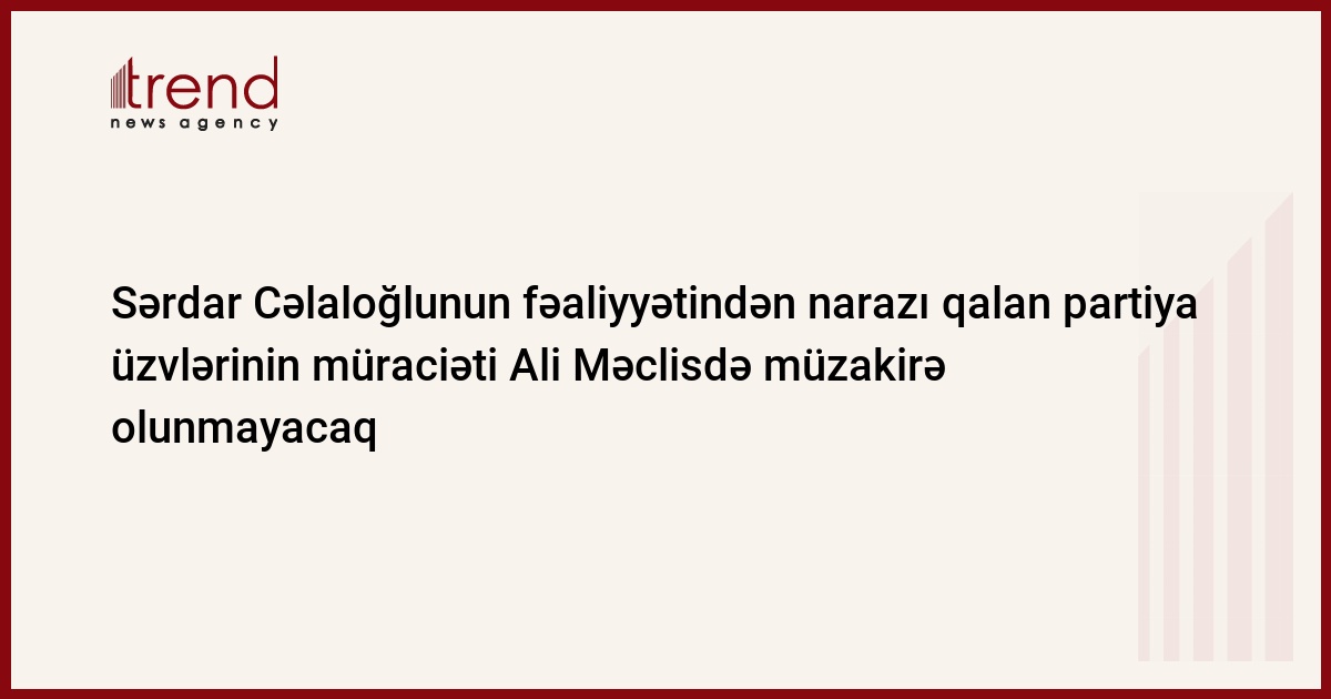 Azərbaycan Demokrat Partiyası (ADP) sədrinin birinci müavini Sərdar Cəlaloğlunun fəaliyyətindən narazı olan 18 partiya üzvünün Ali Məclisə ünvanladığı müraciət məclisin fevralın 12-də keçiriləcək iclasında müzakirə olunmayacaq. Bu barədə Trend ə ADP Ali Məclisinin sədri Akif Şahbazov bildirib.