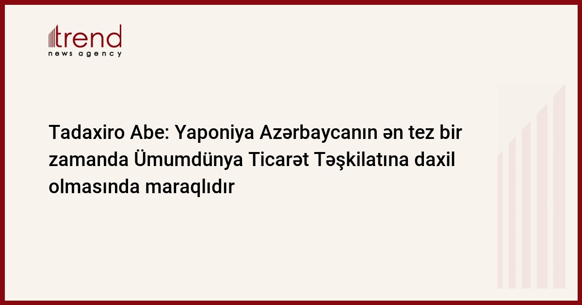 Yaponiya Azərbaycanın Ümumdünya Ticarət Təşkilatına (ÜTT) üzv olmaq istəyini alqışlayır. Belə bir bəyanatla Yaponiyanın Azərbaycandakı səfiri Tadaxiro Abe Trend in müxbirinin xahişi ilə rəsmi Tokionun Vzərbaycanın ÜTT-na üzvlüyü ilə bağlı mövqeyini şərh edərkən bildirib.