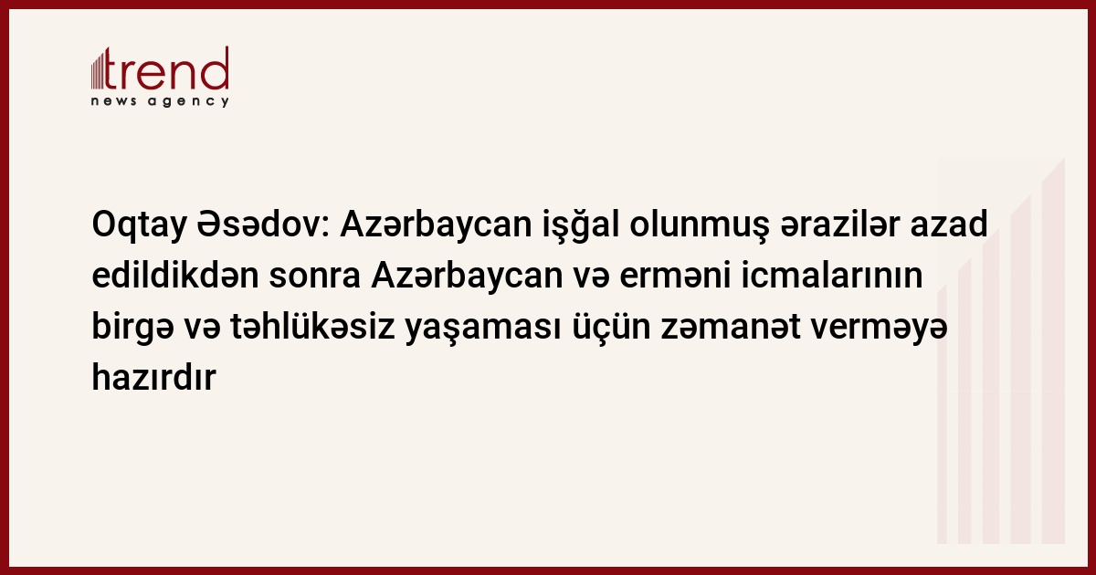 Azərbaycan işğal olunmuş əraziləri azad edildikdən sonra Azərbaycan və erməni icmalarının dinc birgə yaşaması üçün zəmanət verməyə hazırdır. Trend ANS telekanalına istinadən bildirir ki, fevralın 16-da Azərbaycan Milli Məclisinin sədri Oqtay Əsədov Avropa Komissiyasının Xarici Əlaqələr və Avropa Qonşuluq Siyasəti üzrə komissarı xanım Benita Ferrero Ialdnerlə görüşündə bu barədə bəyan edib.