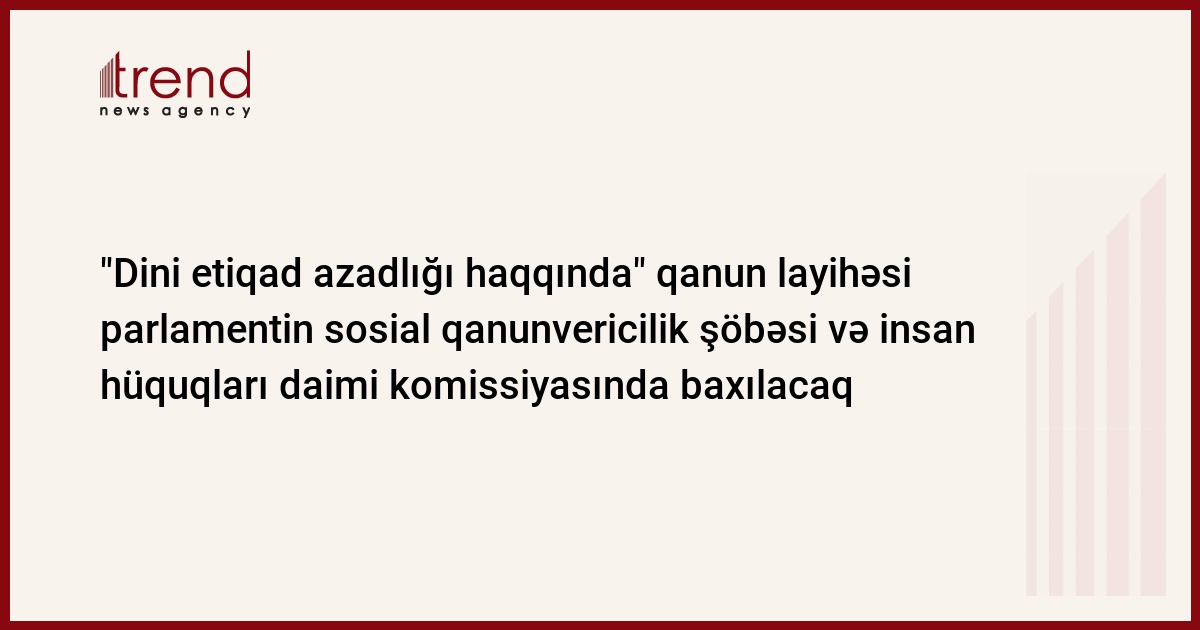 Milli Məclisin insan hüquqları daimi komissiyası ilə sosial qanunvericilik şöbəsi "Dini etiqad haqqında" qanun layihəsi üzərində birgə işləyəcək. Bu barədə Trend ə parlamentin sosial qanunvericilik şöbəsinin müdiri Adilə Abbasova bildirib.