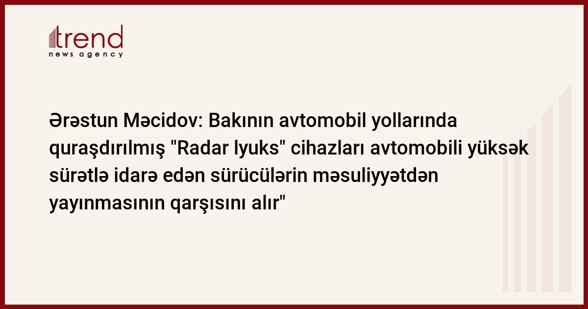 Bakı şəhərinin avtomobil yollarında quraşdırılmış "Radar lyuks" cihazları avtomobili yüksək sürətlə idarə edən sürücülərin məsuliyyətdən yayınmasının qarşısını tam şəkildə alır. Bu barədə Trend ə Azərbaycan Respublikası Dövlət Yol Polisi İdarəsinin yol hərəkətinin təhlükəsizliyinin təmini və ictimai qurumlarla əlaqələr şöbəsinin rəisi Ərəstun Məcidov məlumat verib.