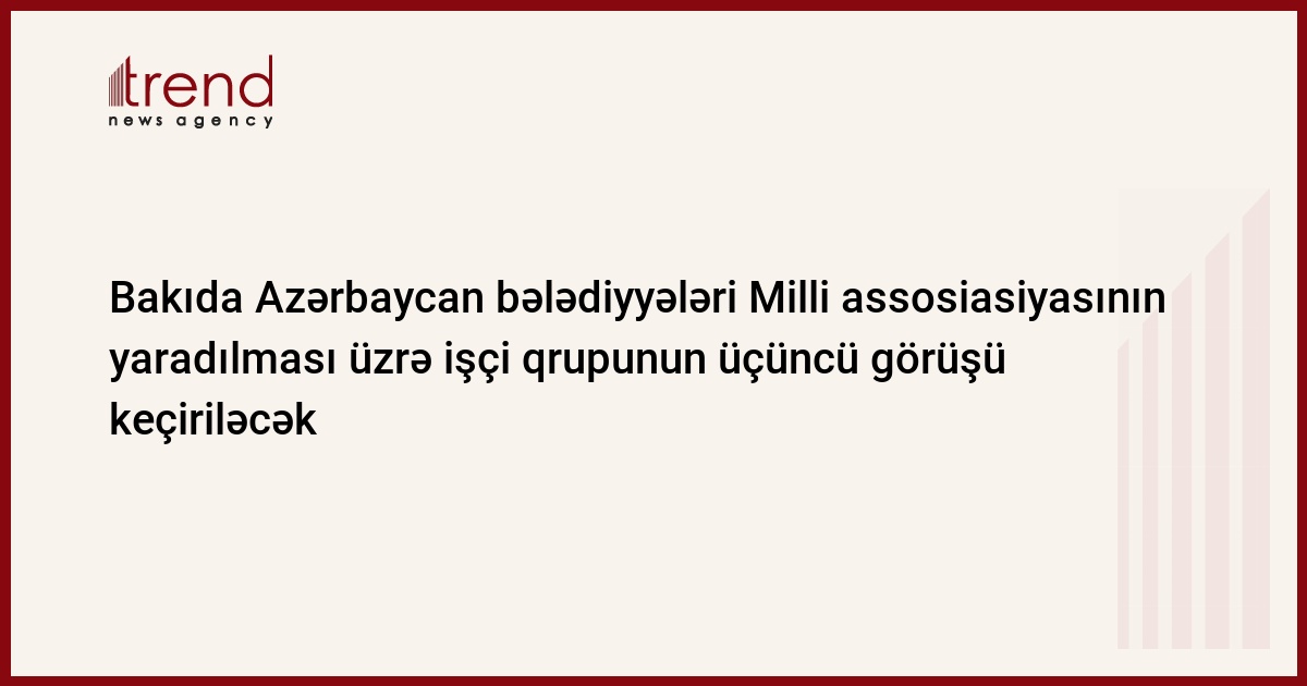 Aprelin 6-7-də Bakıda Azərbaycan bələdiyyələri Milli assosiasiyasının (BMA) yaradılması üzrə işçi qrupunun üçüncü görüşü keçiriləcək. Trend bildirir ki, 25 bələdiyyə üzvünün daxil olduğu işçi qrup Avropa Şurası (AŞ) yerli və regional özünüidarə orqanları Konqresinin dəstəyilə yaradılıb.