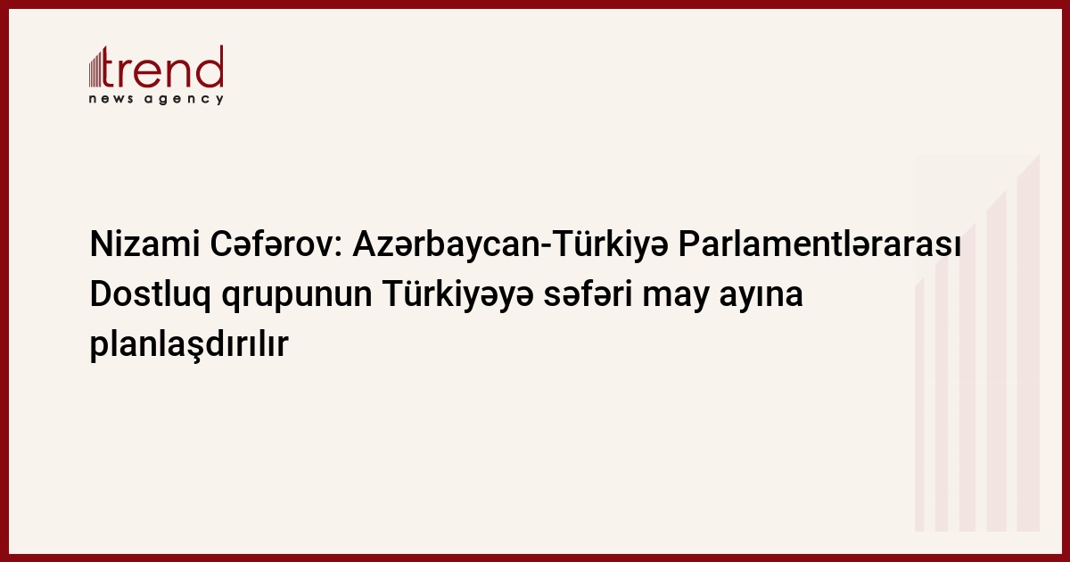 Azərbaycan-Türkiyə Parlamentlərarası Dostluq qrupunun Türkiyəyə səfəri may ayına planlaşdırılır. Bu barədə Trend ə Azərbaycan-Türkiyə Parlamentlərarası Dostluq qrupunun rəhbəri, millət vəkili Nizami Cəfərov məlumat verib. O, bildirib ki, bu səfərlə bağlı Türkiyənin Böyük Millət Məclisi ilə danışıqlar aparılır. N.Cəfərovun sözlərinə görə, danışıqların nəticəsindən asılı olaraq Azərbaycan nümayəndə heyətinin Türkiyəyə deyil, əksinə Türkiyə parlamentinin nümayəndə heyəti Azərbaycana səfər edə bilər.