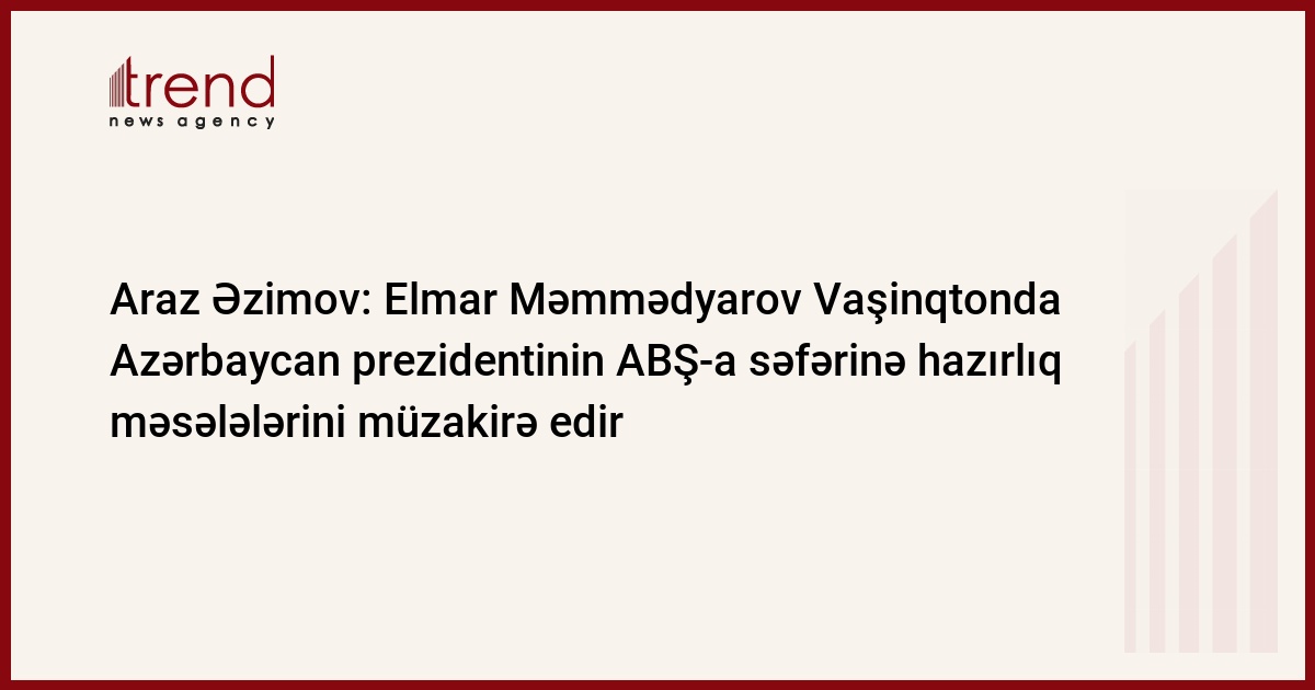 Vaşinqtonda səfərdə olan Azərbaycanın xarici işlər naziri Elmar Məmmədyarov aprelin 6-da Azərbaycan prezidenti İlham Əliyevin ABŞ-a səfərinə hazırlıqla bağlı dövlət katibi Kandoliza Rays və digər şəxslərlə görüşlər keçirib. Trend in verdiyi məlumata görə, bu barədə Azərbaycanın xarici işlər nazirinin müavini Araz Əzimov Bakıdakı mətbuat konfransında bildirib.