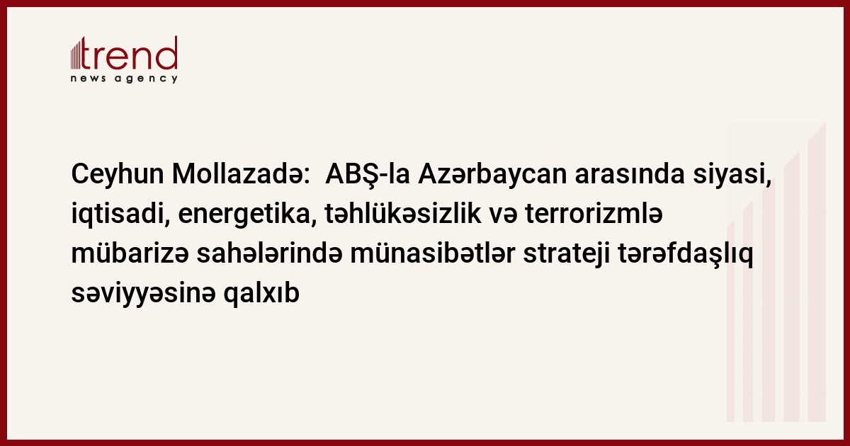 C.Mollazadə onu da qeyd edib ki, bu gün ABŞ-la Azərbaycan arasında siyasi, iqtisadi, energetika, təhlükəsizlik və terrorizmlə mübarizə sahələrində münasibətlər müəyyən maraqlardan strateji tərəfdaşlıq səviyyəsinə qalxıb. C.Mollazadə prezidentlərin danışıqlarında Dağlıq Qarabağ probleminin də müzakirə ediləcəyini istisna etməyib. Ancaq bildirib ki, bu məsələnin həllində tərəflər - Azərbaycanla Ermənistan müəyyən kompromis tapmalıdır: "Burada ABŞ-ın mövqeyi tərəflər arasında müəyyən dərəcədə vasitəçilik etməkdir. ABŞ-ın mövqeyi ondan ibarətdir ki, problem Azərbaycanın ərazi bütövlüyü çərçivəsində həll olunsun. Rəsmi Vaşinqton Azərbaycanın ərazi bütövlüyünü tanıyıb. Ancaq münaqişənin necə həll olunacağı Azərbaycan prezidenti ilə ABŞ prezidenti və Vaşinqton administrasiyası arasında müzakirə ediləcək. Ancaq heç bir tərəf Azərbaycanı münaqişənin necə həll olunmasına məcbur edə bilməz".
