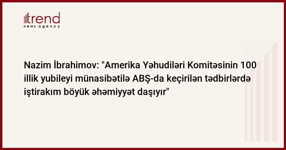 Xarici Ölkələrdə Yaşayan Azərbaycanlılarla İş üzrə Dövlət Komitəsinin sədri Nazim İbrahimov ABŞ-da səfərdədir. Bu barədə Trend ə Nazim İbrahimov özü məlumat verilib. O, bildirib ki, Amerika Yəhudiləri Komitəsinin 100 illik yubileyi ilə əlaqədar keçiriləcək irimiqyaslı tədbirlərdə iştirak üçün ABŞ-a dəvət olunub. Onun sözlərinə görə, mayın 4-də Vaşinqton şəhərində Amerika Yəhudiləri Komitəsinin 100 illik yubileyi ilə bağlı böyük bir konfrans keçiriləcək. Həmin tədbirdə ABŞ prezidenti, Almaniyanın, Avstriyanın, İzrailin baş nazirləri, həmçinin başqa dövlətlərin nazirləri, yüksək rütbəli dövlət nümayəndələri, çoxsaylı nüfuzlu qonaqlar iştirak edəcəklər. Azərbaycanı isə bu mərasimdə Nazim İbrahimov təmsil edəcək.