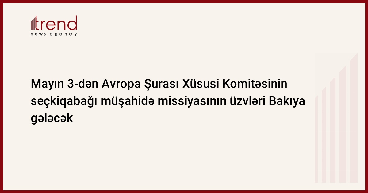 Milli Məclisə mayın 13-də keçiriləcək təkrar seçkiləri izləmək üçün Avropa Şurasının Xüsusi Komitəsinin seçkiqabağı müşahidə missiyasının üzvləri mayın 3-dən Azərbaycana gəlməyə başlayıb. Bu barədə Trend ə Milli Məclisdən bildiriblər.