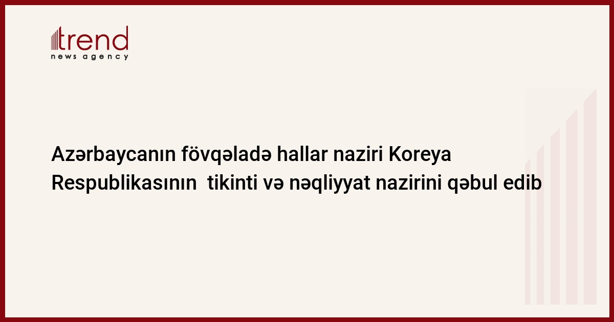 Mayın 11-də Azərbaycanın fövqəladə hallar naziri Kəmaləddin Heydərov Koreya Respublikasının ölkəmizdə səfərdə olan tikinti və nəqliyyat naziri Çu Dyunq Jiki qəbul edib. Bu barədə Trend ə Fövqəladə Hallar Nazirliyinin ictimaiyyətlə əlaqə idarəsindən məlumat verilib.