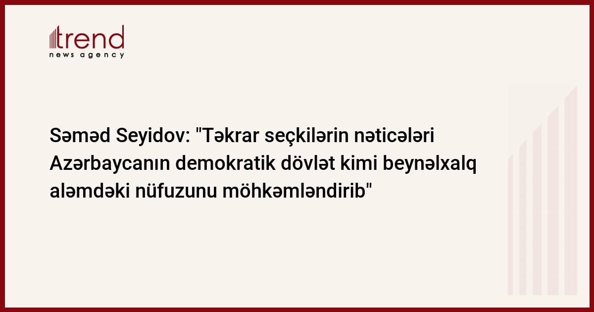 Mayın 13-də Milli Məclisə keçirilən təkrar seçkilərin nəticələri Azərbaycanın demokratik dövlət kimi beynəlxalq aləmdəki nüfuzunu möhkəmləndirib. Bu barədə Trend ə Azərbaycanın Avropa Şurası Parlament Assambleyasındakı nümayəndə heyətinin rəhbəri Səməd Seyidov bildirib.