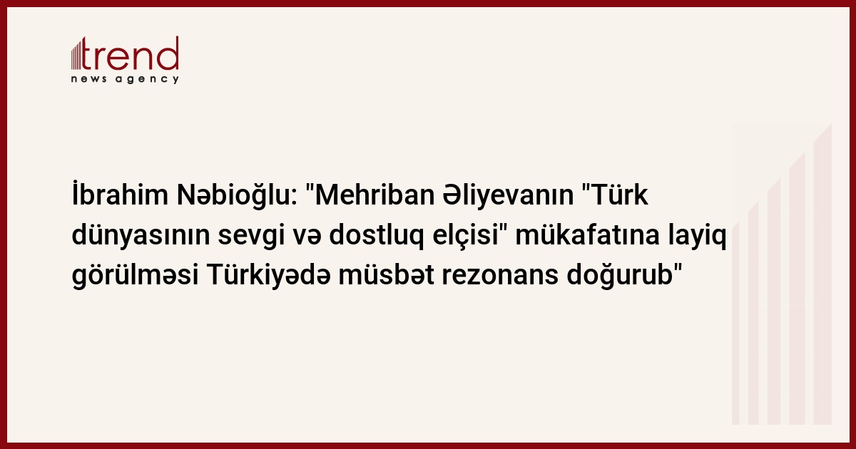"Heydər Əliyev Fondunun prezidenti, millət vəkili Mehriban Əliyevanın Türkiyədə "Türk dünyasının sevgi və dostluq elçisi" mükafatına layiq görülməsi bu ölkədə müsbət rezonans doğurub". Bu fikirləri Trend ə açıqlamasında Azərbaycanın Türkiyənin İstanbul şəhərindəki Baş konsulu İbrahim Nəbioğlu bildirib.