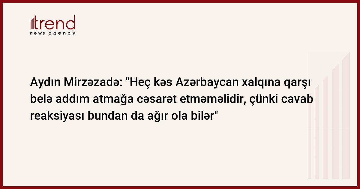 Heç kəs Azərbaycan xalqına qarşı belə addım atmağa cəsarət etməməlidir, çünki cavab reaksiyası bundan da ağır ola bilər". Bu barədə Trend ə hakim Yeni Azərbaycan Partiyası Siyasi Şurasının üzvü, millət vəkili, politoloq Aydın Mirzəzadə İranda soydaşlarımıza qarşı aparılan repressiyalara münasibət bildirərkən qeyd edib.