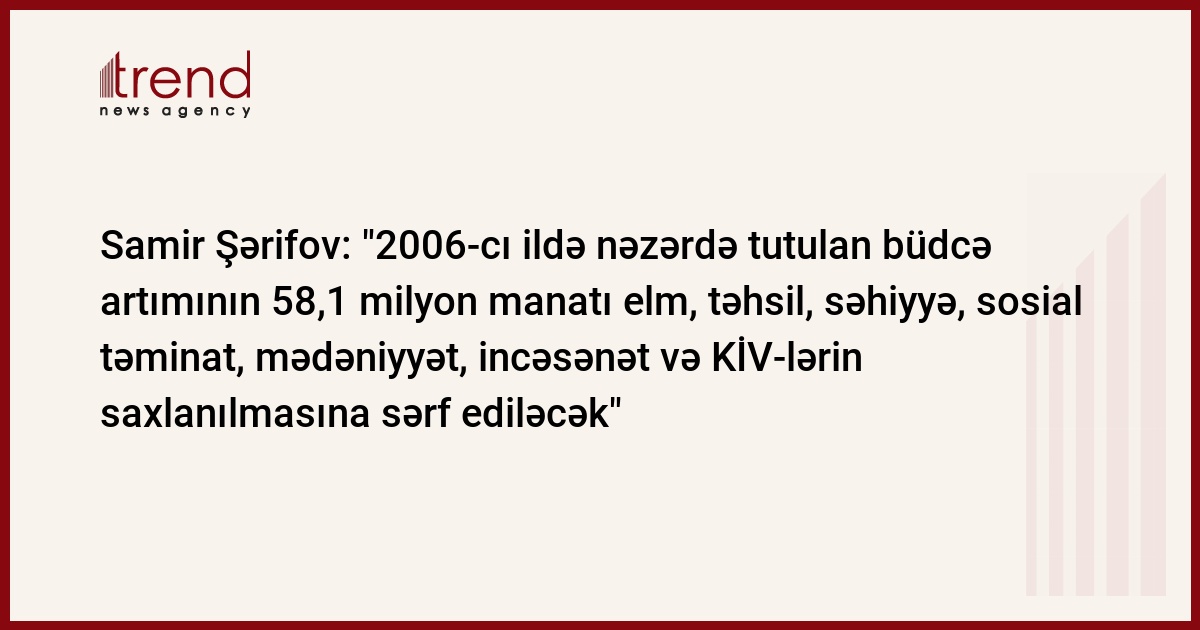 Azərbaycan Respublikasının 2006-cı ildə nəzərdə tutulan büdcə artımının 58,1 milyon manatı və ya 12,8 faizi elm, təhsil, səhiyyə, sosial təminat, mədəniyyət, incəsənət və KİV-lərin saxlanılmasına sərf ediləcək. Trend xəbər verir ki, bu barədə Azərbaycanın maliyyə naziri Samir Şərifov Milli Məclisin mayın 26-da keçirilən növbəti iclasında ölkənin 2006-cı il dövlət büdcəsi haqqında qanuna əlavə və dəyişikliklərin edilməsi zamanı bildirib.
