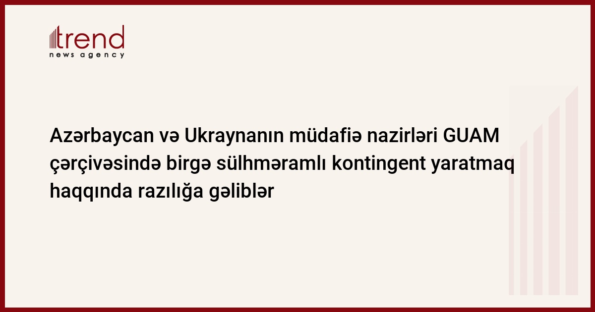 GUAM (Gürcüstan, Ukrayna, Azərbaycan, Moldova) silahlı qüvvələrinin baş qərargah rəislərinin müavinləri iyunun ortalarında birgə sülhməramlı kontingentin yaradılmasını müzakirə edəcək. Bu barədə, Ukrayna Müdafiə Nazirliyi mətbuat xidmətinin verdiyi məlumata əsasən, Ukrayna hərbi qurumunun rəhbəri Anatoliy Qritsenko ilə Azərbaycanın müdafiə naziri Səfər Əbiyev bu gün Bakıda keçirilmiş görüşdə razılığa gəlib.