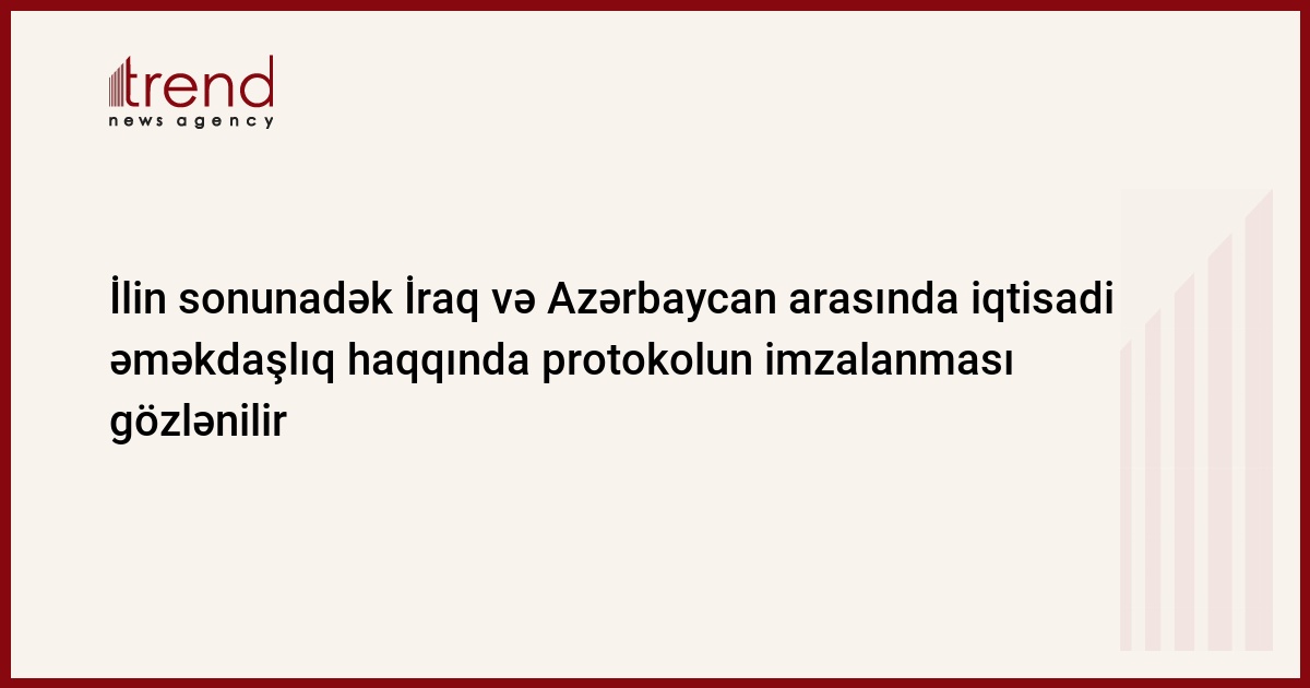 2006-cı ilin sonunadək İraq və Azərbaycan arasında iqtisadi əməkdaşlıq haqqında protokol imzalanacaq. Trend in xəbər verdiyi kimi, bu barədə İraqın Azərbaycandakı səfiri Ərşad Ömər İsmayıl məlumat verib.