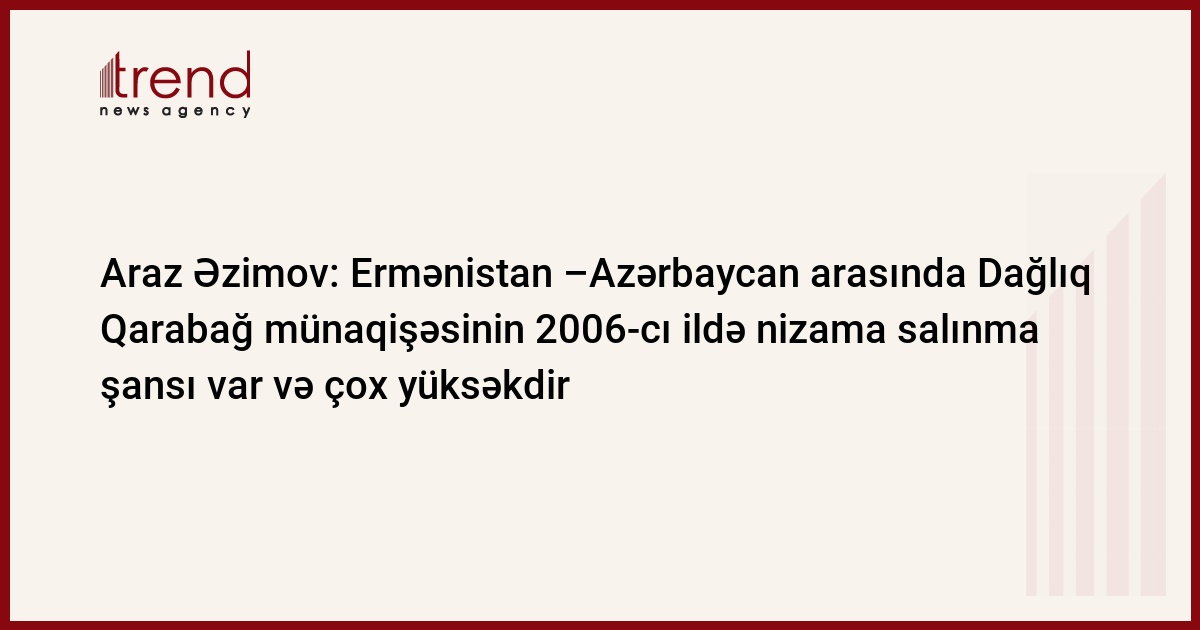 Ermənistan -Azərbaycan arasında Dağlıq Qarabağ münaqişəsinin 2006-cı ildə nizama salınma şansı var və çox yüksəkdir. Lakin əldə olan imkanlardan istifadə etmək lazımdır. Trend in verdiyi xəbərə görə, bu barədə Azərbaycan xarici işlər nazirinin müavini Araz Əzimov iyunun 9-da jurnalistlərə verdiyi müsahibəsində bildirib.