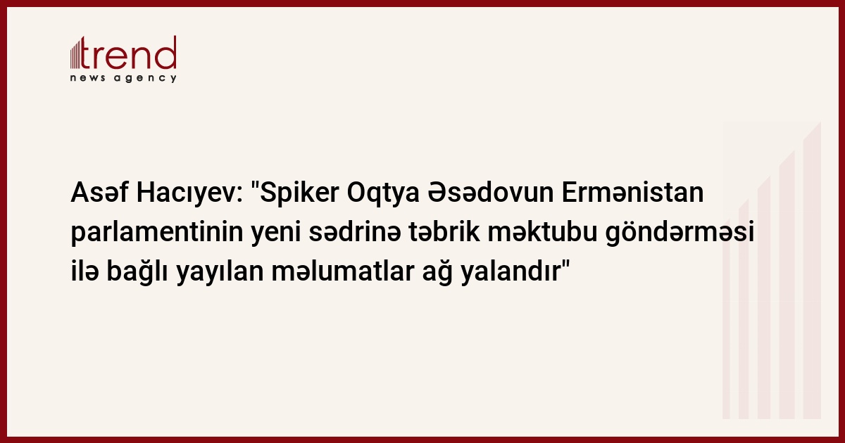 Milli Məclisin spikeri Oqtay Əsədovun Ermənistan parlamentinin yeni sədri Tiqran Torosyana təbrik məktubu göndərməsi ilə bağlı Azərbaycan mətbuatında gedən məlumatların heç biri həqiqətə uyğun deyil. Trend xəbər verir ki, bu barədə Ermənistanda keçirilən Qara dəniz İqtisadi Əməkdaş Təşkilatı Parlament Assambleyasının (QDİƏT PA) iclasında iştirak etmiş Milli Məclisin üzvləri Asəf Hacıyev və Musa Quliyev iyunun 9-da keçirdikləri mətbuat konfransında bildiriblər.