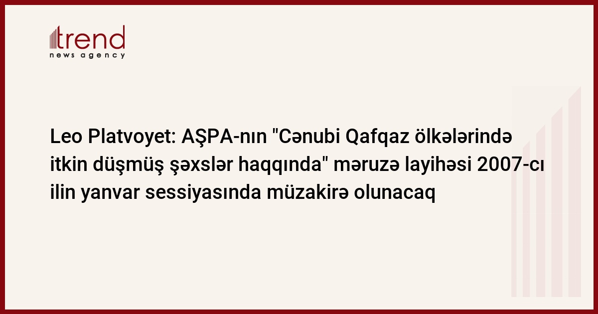 AŞPA-nın "Cənubi Qafqaz ölkələrində itkin düşmüş şəxslər haqqında" məruzə layihəsi 2006-cı ilin payızında hazırlanacaq, son variantı isə AŞPA-nın 2007-ci ilin yanvar sessiyasında müzakirə olunacaq. Bu barədə, Trend agentliyinin məlumatına əsasən, iyunun 9-da AŞPA-nın Cənubi Qafqaz ölkələrində itkin düşmüş şəxslər üzrə məruzəçi, Holland parlamentariyi Leo Platvoyet mətbuat konfransında bildirib.