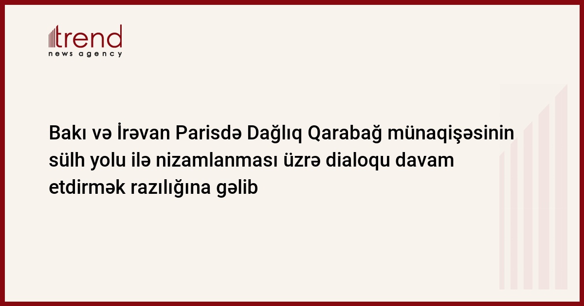 Azərbaycan və Ermənistan Dağlıq Qarabağ münaqişəsinin sülh yolu ilə nizamlanmasına dair danışıqları davam etdirmək razılığına gəlib. Azərbaycan XİN-in Mətbuat və İnformasiya Siyasəti İdarəsinin rəisi Tahir Tağızadənin Trend ə verdiyi məlumata görə, razılıq bir gün əvvəl Parisdə hər iki ölkənin xarici işlər nazirləri Elmar Məmmədyarov və Vardan Oskanyan arasında aparılmış danışıqların növbəti raundunda əldə olunub.