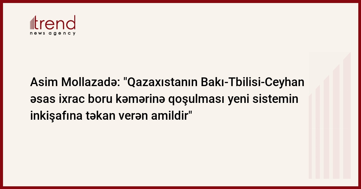 Qazaxıstanın Bakı-Tbilisi-Ceyhan əsas ixrac boru kəmərinə qoşulması yeni sistemin inkişafına təkan verən amildir. Bu barədə Trend ə Demokratik İslahatlar Partiyasının sədri, millət vəkili Asim Mollazadə Qazaxıstanın Bakı-Tbilisi-Ceyhan əsas ixrac boru kəmərinə qoşulmasına münasibət bildirərəkən qeyd edib.