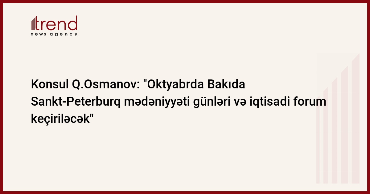 2006-cı ildə Azərbycanda keçirilən Rusiya ili çərçivəsində oktyabr ayında Bakıda Sankt-Peterburq şəhərinin mədəniyyəti günləri keçiriləcək. Bu barədə Trend ə Azərbaycanın Sankt-Peterburq şəhərindəki baş konsulu Qüdsi Osmanov məlumat verib.