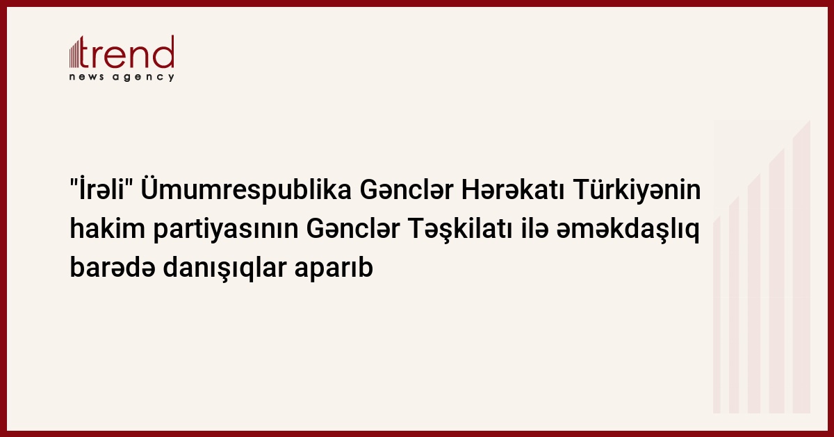 "İrəli" Ümumrespublika Gənclər Hərəkatı rəsmiləri Türkiyənin hakim Ədalət və İnkişaf Partiyasının (ƏİP) Gənclər Təşkilatı rəhbərliyi ilə danışıqlar aparıb. Bu barədə Trend ə adıçəkilən hərəkatdan bildiriblər.