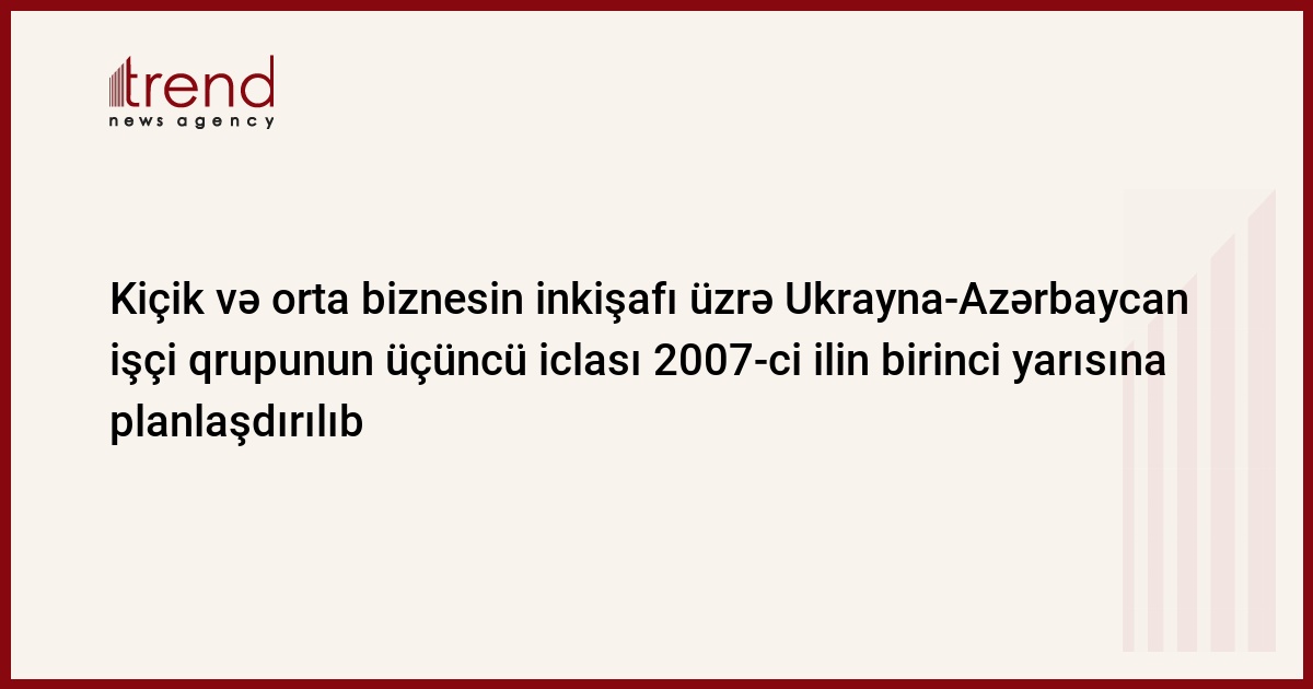 Kiçik və orta biznesin inkişafı üzrə Ukrayna-Azərbaycan işçi qrupunun üçüncü iclası 2007-ci ilin birinci yarısına planlaşdırılıb. Bu barədə Trend in Kiyevdəki xüsusi müxbirinə Ukrayna tənzimləyici siyasət və sahibkarlıq məsələləri üzrə Dövlət komitəsindən (Sahibkarlıq üzrə Dövlət komitəsi) xəbər veriblər.
