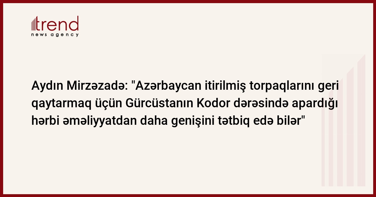 Azərbaycan itirilmiş torpaqlarını geri qaytarmaq üçün Gürcüstanın Kodor dərəsində apardığı hərbi əməliyyatdan daha genişini tətbiq edə bilər. Bu barədə Trend ə hakim Yeni Azərbaycan Partiyası (YAP) Siyasi Şurasının üzvü, millət vəkili, politoloq Aydın Mirzəzadə Gürcüstanın Kodor dərəsində apardığı hərbi əməliyyata münasibət bildirərəkən qeyd edib.
