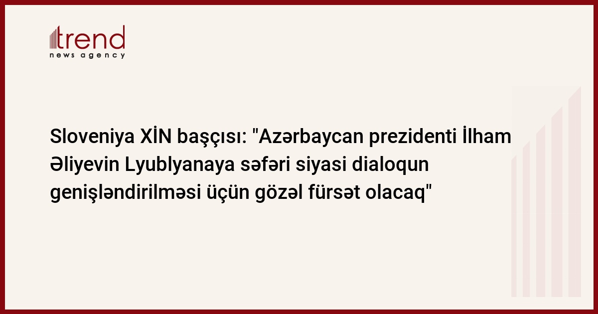 - Azərbaycan prezidenti İlham Əliyevin Sloveniyaya planlaşdırılan rəsmi səfəri gələcəkdə hər iki ölkə arasında ikitərəfli və çoxtərəfli əməkdaşlıqda siyasi dialoqun inkişaf etdirilməsi üçün gözəl fürsət olacaq. Bu səfər, həmçinin, əməkdaşlığın bütün sahələrini nəzərdən keçirməyə və bunlardan hansıların ölkələrimiz üçün xüsusilə vacib olduğunu müəyyən etməyə imkan verəcək. Bundan başqa, bizim mövcud geniş spektrli beynəlxalq məsələlərə və dünyada təhlükəsizlik problemlərinə dair fikir mübadiləsi aparacağımız da gözlənilir.