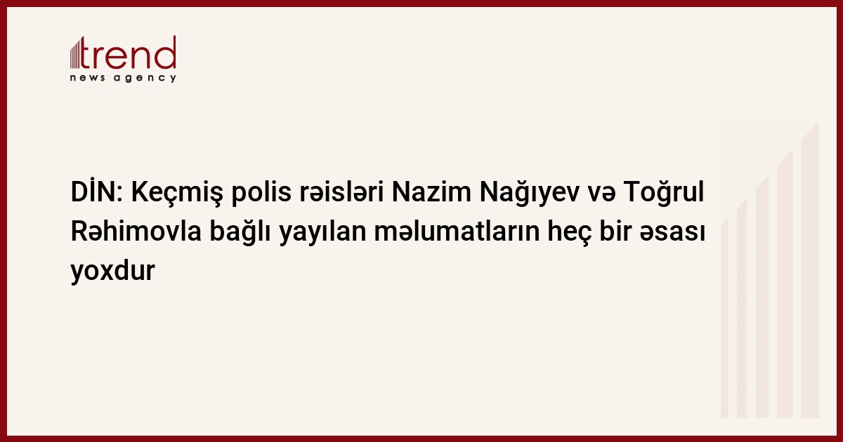 Bakı şəhəri Binəqədi rayon Polis İdarəsinin keçmiş rəisi Nazim Nağıyev və Sabunçu rayon Polis İdarəsinin keçmiş rəisi Toğrul Rəhimovla bağlı ictimaiyyət arasında yayılan müxtəlif məlumatların heç bir əsası yoxdur. Bu barədə Trend ə Azərbaycan Respublikası Daxili İşlər Nazirliyinin mətbuat xidmətinin inspektoru Ehsan Zahidov məlumat verib.