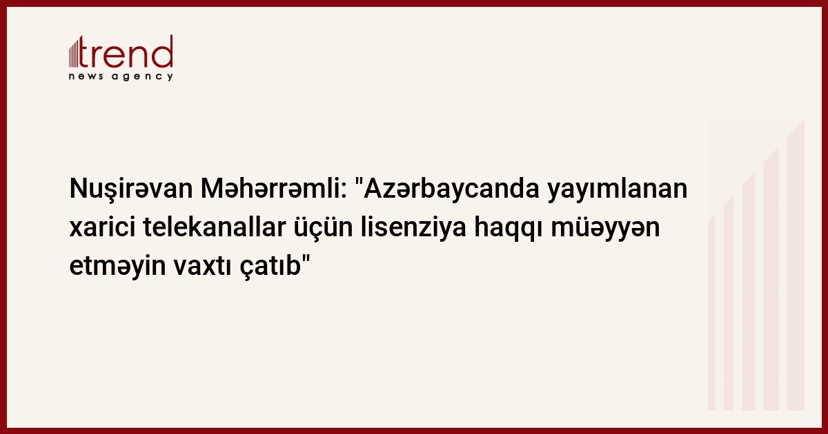 "Azərbaycanda yayımlanan xarici telekanalların fəaliyyəti üçün lisenziya haqqı müəyyən etməyin vaxtı gəlib çatıb". Bu fikirləri Trend ə açıqlamasında Milli Televiziya və Radio Şurasının sədri Nuşirəvan Məhərrəmli bildirib.