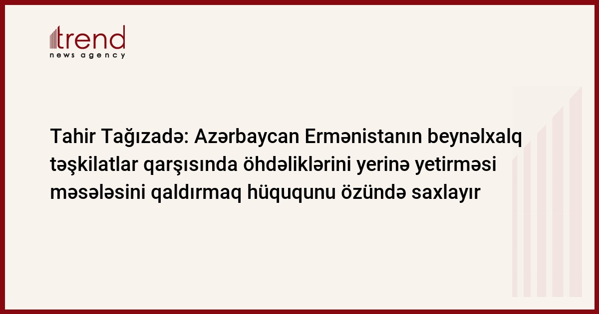 Azərbaycan Ermənistanın beynəlxalq təşkilatlar qarşısında öhdəliklərinin yerinə yetirilməsi məsələsini qaldırmaq hüququnu özündə saxlayır. Bu barədə Trend ə Azərbaycanın Xarici İşlər Nazirliyinin mətbuat və informasiya idarəsinin rəisi Tahir Tağızadə bildirib.
