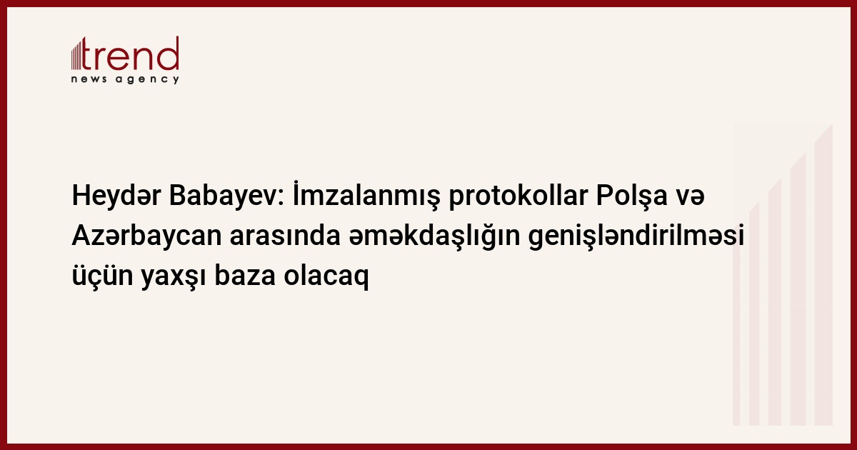 Öz növbəsində, iqtisadi inkişaf naziri Heydər Babayev əlavə edib ki, enerji təhlükəsizliyi və aqrosənaye kompleksi, turizm, nəqliyyat, bank-maliyyə və digər sahələrində ikitərəfli əməkdaşlıq kimi məsələlərin əks olunduğu protokolların imzalanması Polşa-Azərbaycan əməkdaşlığının genişləndirilməsi üçün yaxşı baza olacaq.