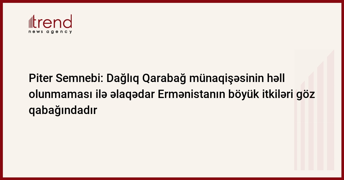 "Hazırda mən nikbinlik hiss etmirəm. Tərəfləri də ittiham etmək istəmirəm. Ancaq Ermənistan və Azərbaycan münaqişənin həll olunmaması nəticəsində təhlükə və itkilər barədə düşünməlidir. Ermənistanın böyük itkilərə məruz qaldığı göz qabağındadır. Ölkənin nisbi təcrid edilməsi isə Dağlıq Qarabağ münaqişəsinin birbaşa nəticəsidir", - deyə Piter Semnebi bəyan edib.