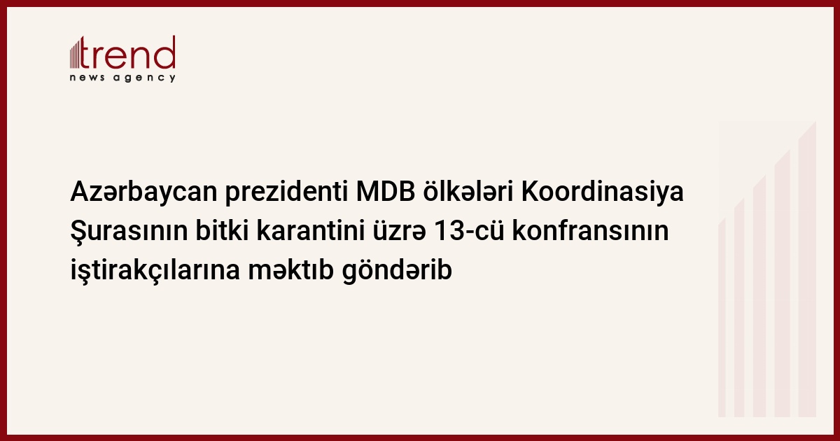 Azərbaycan prezidenti İlham Əliyev MDB ölkələri Koordinasiya Şurasının bitkilərin karantini üzrə 13-cü konfransının iştirakçılarına məktıb göndərib. Trend in verdiyi xəbərə görə, dövlət başçısı qeyd edib ki, beynəlxalq təşkilatlar, o cümlədən FAO və Aralıq dənizi və Avropa ölkələri bitkilərinin karantininin təşkili və mühafizəsi Azərbaycanda fitosanitariyanın inkişafına dəstək göstərib.