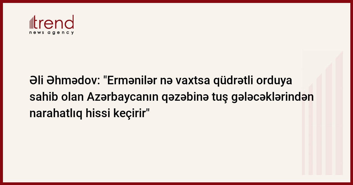 "Ermənilər nə vaxtsa qüdrətli orduya sahib olan Azərbaycanın qəzəbinə tuş gələcəyindən narahatlıq hissi keçirir". Bu barədə Trend ə hakim Yeni Azərbaycan Partiyası (YAP) sədrinin müavini-icraçı katibi, millət vəkili Əli Əhmədov Ermənistan prezidenti və xarici işlər nazirinin Azərbaycana qarşı irəli sürdükləri bir sıra ittihamlara münasibət bildirərkən qeyd edib.