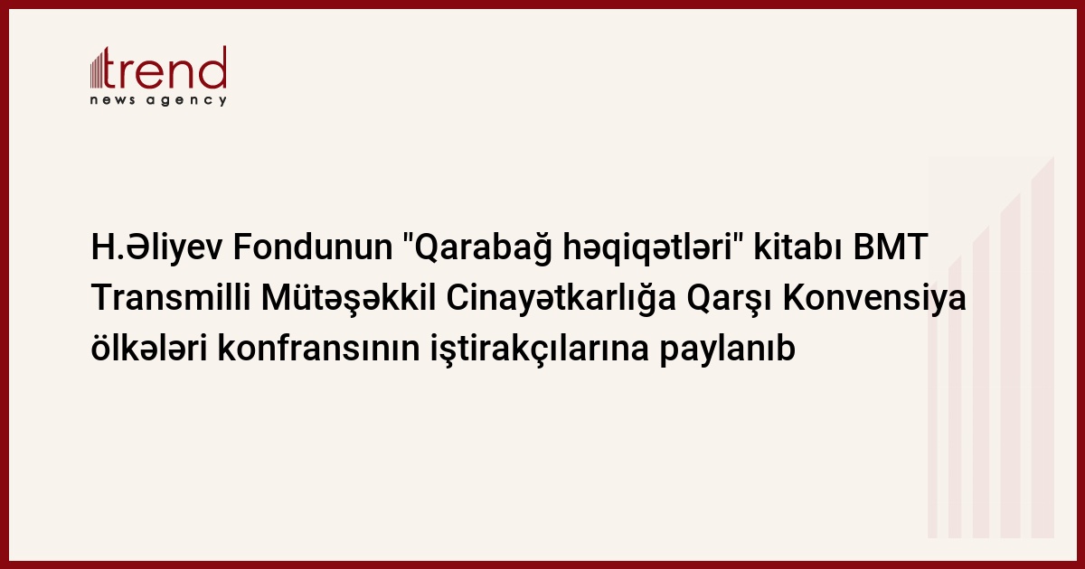 H.Əliyev Fondunun "Qarabağ həqiqətləri" adlı kitabı BMT Transmilli Mütəşəkkil Cinayətkarlığa Qarşı Konvensiyası ölkələri konfransının 3-cü sessiyasının iştirakçılarına paylanıb. Bu barədə Trend ə Azərbaycanın Avstriyadakı səfirliyindən məlumat verilib.