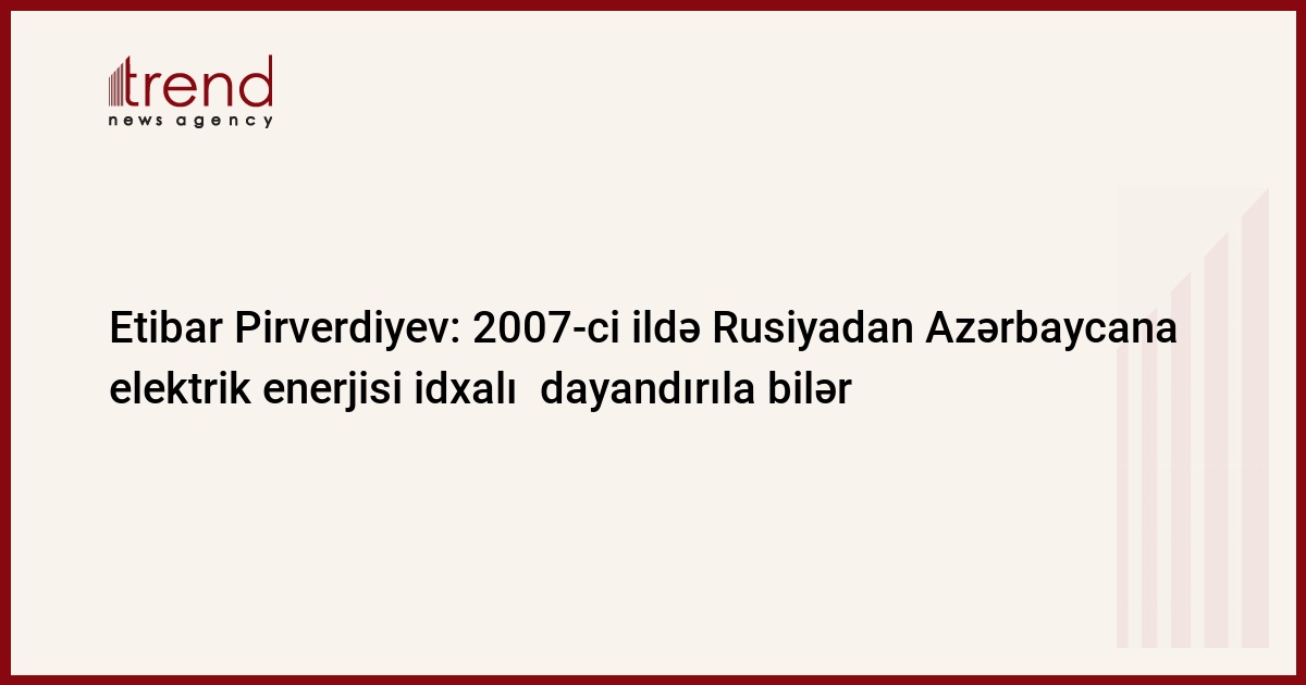 2007-ci ildə Azərbaycana Rusiyadan idxal olunan elektrik enerjisinin tədarük həcmi sıfra bərabər ola bilər. Trend in xəbər verdiyi kimi, bu barədə bugünkü mətbuat konfransında "Azərenerji" səhmdar cəmiyyətinin (SC) prezidenti Etibar Pirverdiyev məlumat verib.