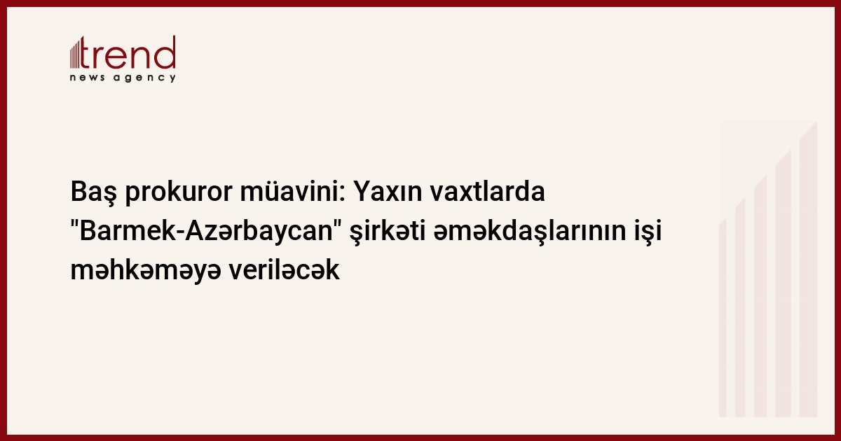 "Barmek-Azərbaycan" şirkəti əməkdaşlarının işi yaxın vaxtlarda məhkəməyə veriləcək. Trend xəbər verir ki, bu barədə Azərbaycan baş prokurorunun birinci müavini Rustəm Usubov bildirib.