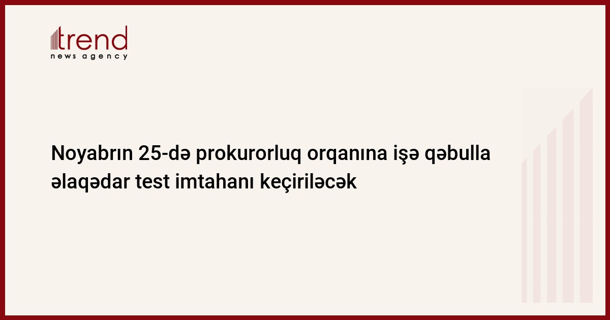 Noyabrın 25-də Azərbaycanın prokurorluq orqanına işə qəbulla əlaqədar test imtahanı keçiriləcək. Bu barədə Trend ə Azərbaycan Respublikası Baş Prokurorluğu mətbuat xidmətinin rəhbəri Vüqar Əliyev məlumat verib.