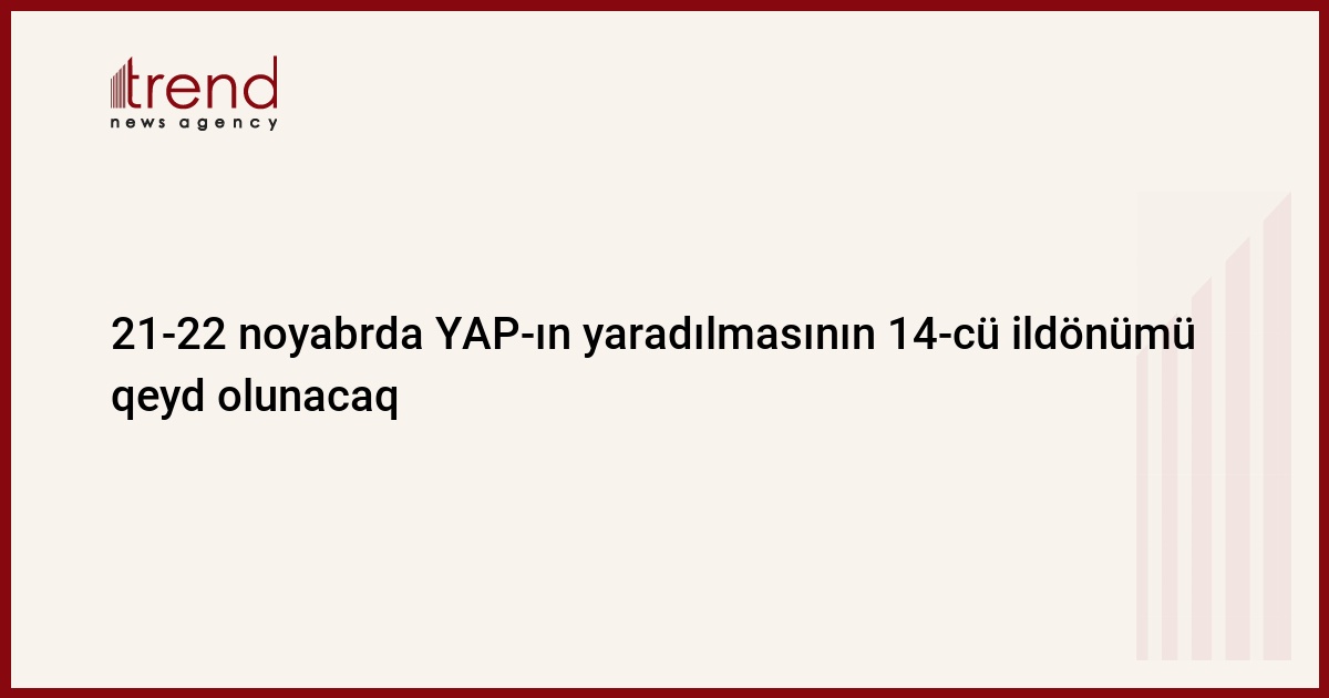 Sabah - noyabrın 21-də hakim Yeni Azərbaycan Partiyasının (YAP) yaradılmasının 14-cü ildönümü qeyd olunacaq. Bu barədə Trend ə YAP-dan məlumat verilib.