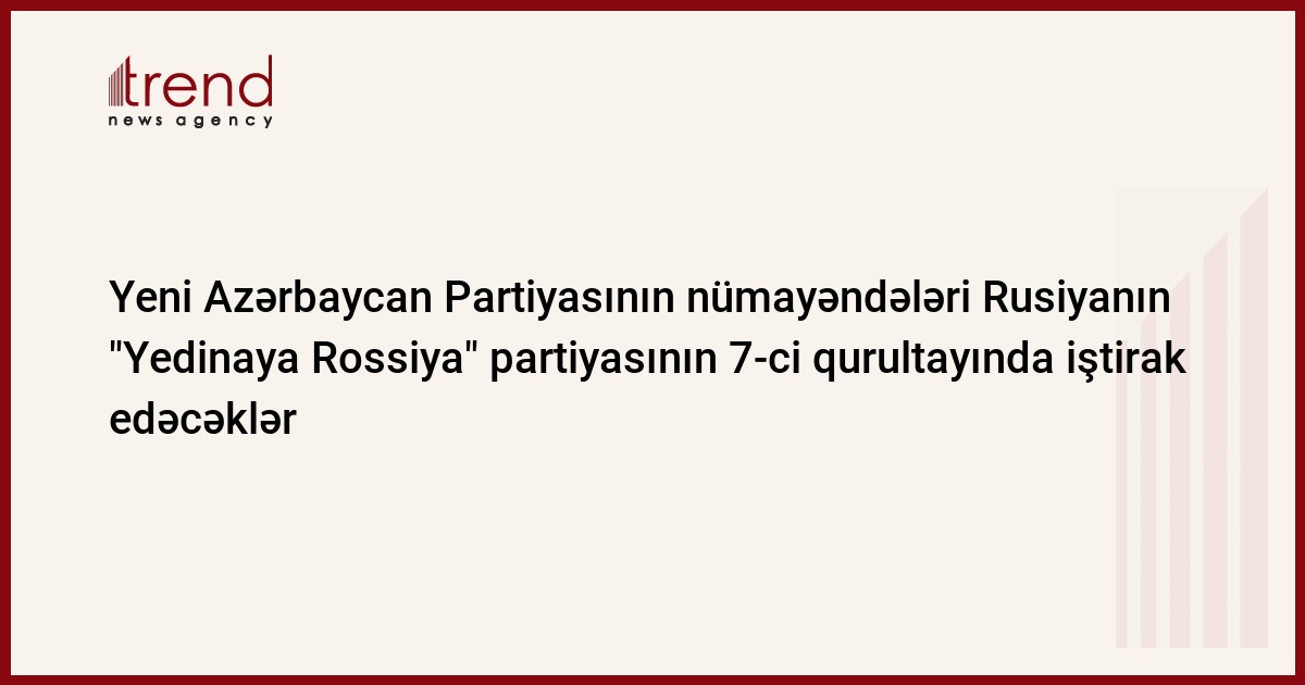 Noyabrın sonunda Yeni Azərbaycan Partiyasının (YAP) nümayəndələri Rusiyanın hakim partiyası olan "Yedinaya Rossiya" partiyasının 7-ci qurultayında iştirak edəcəklər. Trend in xəbərinə görə, bu barədə jurnalistlərə YAP-ın sədr müavini və icra katibi, millət vəkili Əli Əhmədov məlumat verib.
