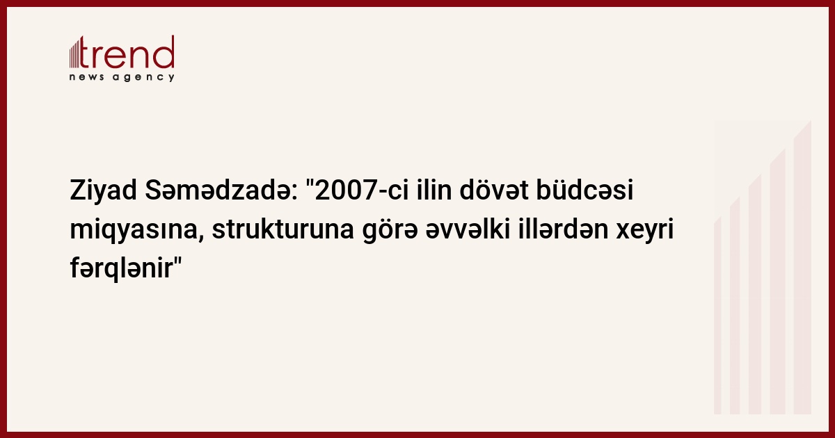 "2007-ci ilin dövət büdcəsi özünün miqyasına, strukturuna görə əvvəlki illərdən xeyri fərqlənir". Trend in məlumatına görə, bu fikirləri jurnalistlərə açıqlamasında Milli Məclisin iqtisadi-siyasət daimi komissiyasının sədri Ziyad Səmədzadə bildirib.