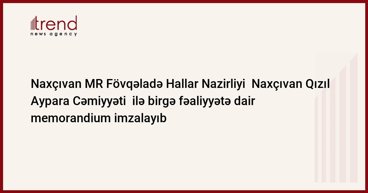 Naxçıvan MR Fövqəladə Hallar Nazirliyi Naxçıvan Qızıl Aypara Cəmiyyəti ilə birgə fəaliyyətə dair memorandium imzalayıb. Trend in Naxçıvan Bürosu xəbər verir ki, anlaşmanın imzalanması hər iki təşkilat arasında fövqaladə hallara hazırlıq, onlara reaksiyavermə sahəsində sıx əməkdaşlığı nəzərdə tutur.