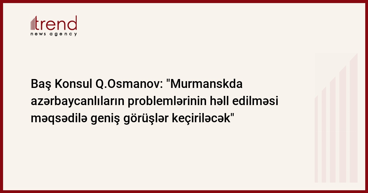 Azərbaycan Respublikasının Xarici İşlər Nazirliyinin tapşırığına əsasən, Rusiya Federasiyasının Şimali-Qərb Federal dairəsinə daxil olan vilayətlərə səfər çərçivəsində Sankt-Peterburq şəhərindəki baş konsul Qüdsi Osmanovun başçılığı ilə nümayəndə heyəti dekabrın 6-7-də Murmansk şəhərinə səfər edəcək. Bu barədə Trend ə Azərbaycanın Sankt-Peterburqdakı Baş Konsulluğundan məlumat verilib.