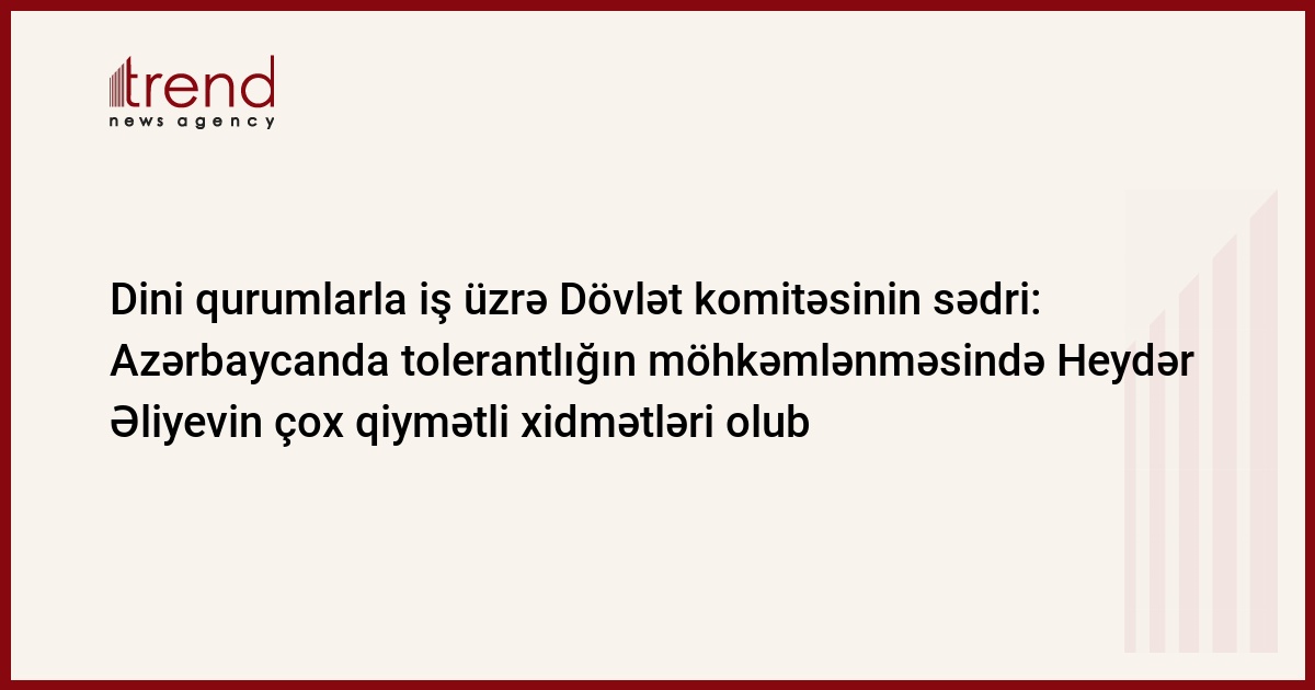 Minillik ərzində Azərbaycanda dini tolerantlıq yaradılıb, dostluq və qarşılıqlı anlaşma atmosferində keçən dinlərarası dialoq mövcuddur və tolerantlığın möhkəmlənməsində Heydər Əliyevin çox qiymətli xidmətləri olub. Trend xəbər verir ki, bu barədə dekabrın 7-də Azərbaycanın Dini qurumlarla iş üzrə Dövlət komitəsinin sədri Hidayət Orucov ümummilli lider, Azərbaycanın eks-prezidenti Heydər Əliyevin ölümünün üçüncü ildönümü ərəfəsində Dövlət komitəsinin binasında onun büstünün açılış mərasimində çıxış edərkən məlumat verib.