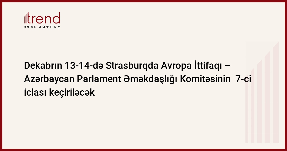 Dekabrın 13-14-də Strasburqda Avropa İttifaqı - Azərbaycan Parlament Əməkdaşlığı Komitəsinin 7-ci iclası keçiriləcək. İclasda Milli Məclis sədrinin müavini, Təbii ehtiyatlar, energetika və ekologiya məsələləri daimi komissiyasının sədri Ialeh Ələsgərovun başçılığı ilə parlament nümayəndə heyeti iştirak edəcək. Nümayəndə heyətinin tərkibinə Milli Məclisin komissiya sədrlərinin müavinləri Rövşən Rzayev, Azər Əmiraslanov, deputatlardan Gülər Əhmədova, Jalə Əliyeva, Çingiz Əsədullayev, Rauf Əliyev, Ülvi Quliyev və Fuad Muradov daxildirlər.